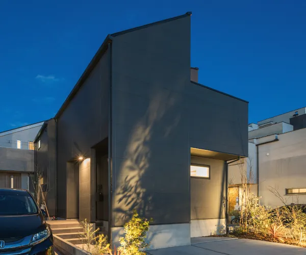 高性能とデザインを両立させた住まいにしたいと、モダンな外観と採光にこだわった事例です。夜になると、外壁が暖かみのある照明でライトアップされて幻想的な光景に。植栽の影が美しく映り、より洗練された佇まいとなります。